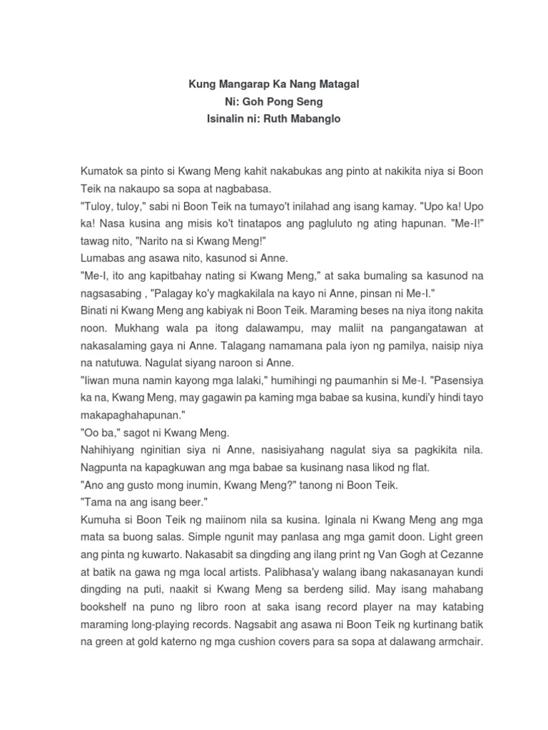GOH POH SENG. Kung Mangarap Ka Nang Matagal Filipino translation of Goh Poh Sengs If We Dream Too Long commissioned and published by Toyota Foundation and Solidarity Foundation Translation Series Manila. Jan 04 2012 45 Kung Mangarap Ka Nang MatagalKabanata LabingwaloKUMATOK SA PINTO SI KWANG MENG kahit nakabukas ang pinto at nakikita niya si Boon Teik na nakaupo sa sopa at nagbabasaTuloy tuloy.